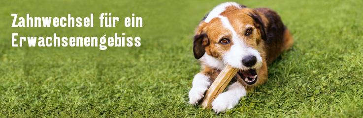Sie müssen dabei einfach schauen, welche Vorlieben er hat. Es gibt Kauspielzeug aus Gummi, zum Beispiel mit Vanillegeschmack, in das er beißen kann. Manche Hunde lieben Spieltaue. Oder aber Ihr Junghund hat ein Faible für Kauknochen. Egal, ob Büffelhautknochen, Rinderkopfhaut oder Rinderohr, Hauptsache, es schmeckt und stillt den Juckreiz. Da diese Kausachen aber nicht wenige Kalorien haben, sollten Sie dies bei der Fütterung mit einrechnen. Eventuell müssen Sie Ihrem Hundekind in dieser Zeit übrigens das Trockenfutter einweichen, damit es dieses besser kauen kann. Oder aber Sie füttern während des Zahnwechsels Nassfutter.